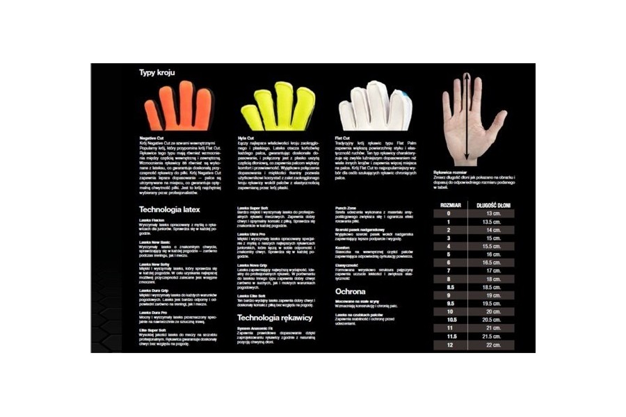 Rozmiar rękawic dobiera się na podstawie długości dłoni mierzonej od czubka środkowego palca do podstawy dłoni przy nadgarstku. Otrzymany wynik w centymetrach należy dopasować do tabeli rozmiarów widocznej na grafice produktu. Jeśli pomiar znajduje się pomiędzy dwoma rozmiarami, zaleca się wybór większego modelu, aby zapewnić pełen komfort i swobodę ruchu podczas gry.
