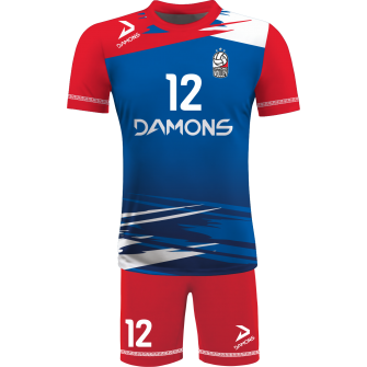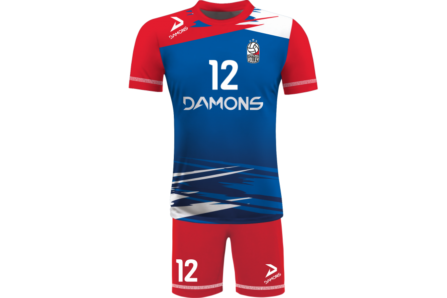 Zamów Strój Siatkarski Męski Omega 5 Niebiesko-Czerwony z nadrukami i numeracją, a przygotujemy wizualizację dla Twojej drużyny!