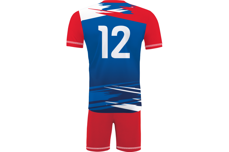W tym wariancie pierwsze wrażenie buduje kontrast między chłodnym niebieskim a mocną czerwienią, który od razu nadaje kompletowi rytm i boiskową energię. Niebieska część porządkuje sylwetkę stroju i tworzy sportową bazę, natomiast czerwone rękawy oraz dolna część kompletu wzmacniają dynamikę projektu i dodają mu bardziej ofensywnego charakteru. To strój meczowy do siatkówki halowej, który dobrze sprawdza się w zespołach chcących wyglądać wyraziście, ale nadal spójnie i profesjonalnie. Techniczna dzianina zapewnia wygodę użytkowania, elastyczność, oddychalność i szybkie schnięcie, a sublimacja odpowiada za trwałość nadruków oraz pełną personalizację projektu.