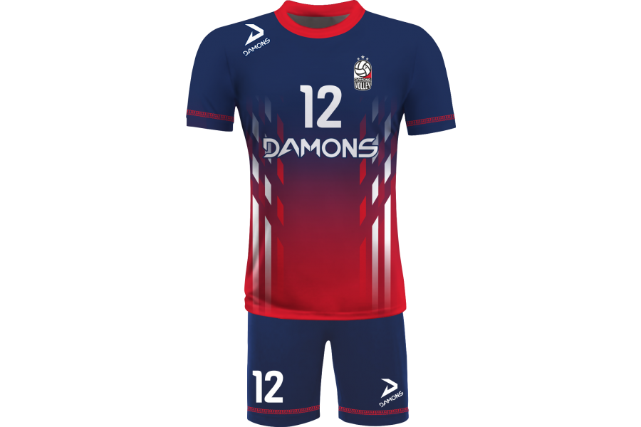 Zamów Strój Siatkarski Męski Omega 7 Granatowo-Czerwony z nadrukami i numeracją, a przygotujemy wizualizację dla Twojej drużyny!