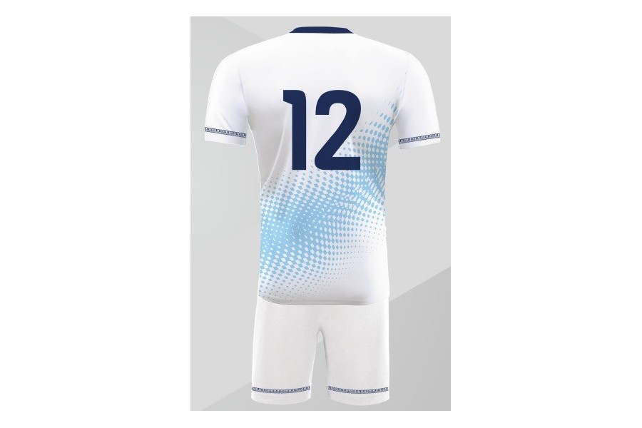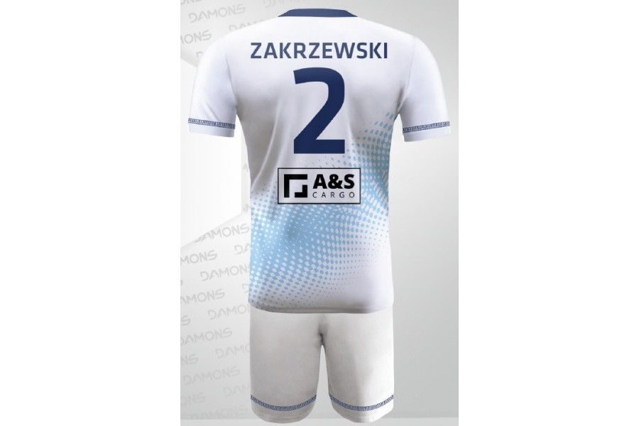 Biało-niebieski wariant Omega 9 buduje wrażenie świeżości, porządku i sportowej lekkości, dlatego bardzo dobrze prezentuje się podczas rozgrywek halowych. Jasna baza rozświetla projekt i pomaga mocno wyeksponować numerację oraz oznaczenia drużynowe, a niebieskie akcenty nadają kompletowi chłodniejszy, bardziej techniczny charakter. Dzięki temu strój wygląda dynamicznie, ale zachowuje przejrzystą i estetyczną formę. Tonalny wzór dodaje głębi, a techniczna dzianina wspiera komfort użytkowania podczas intensywnej gry. Elastyczny materiał, dobra oddychalność i szybkie schnięcie idą tu w parze z sublimacją, która zapewnia trwałość nadruków oraz pełną personalizację projektu.