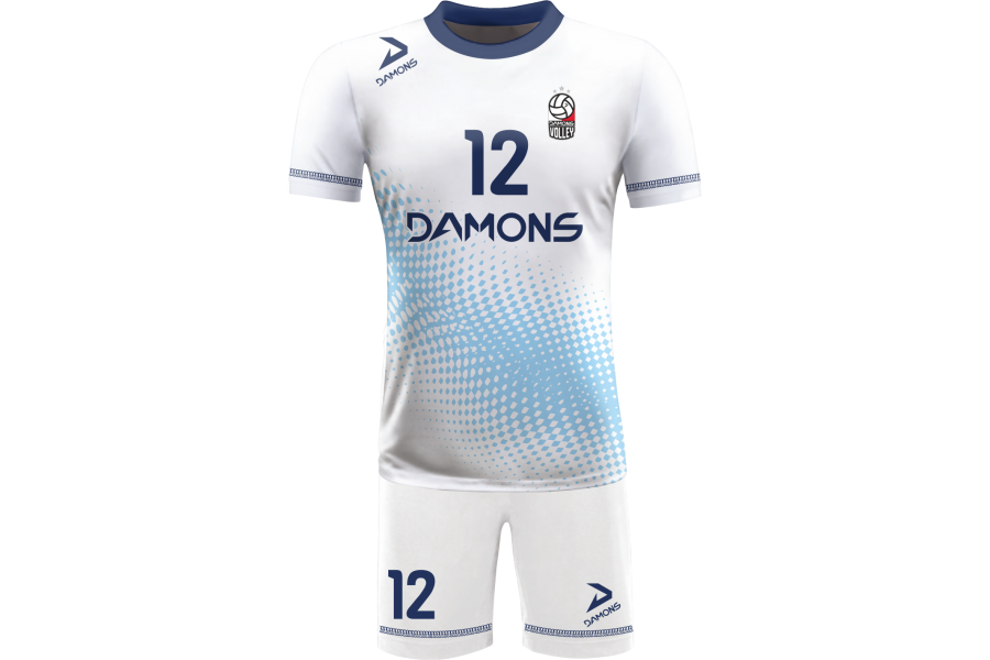 Zamów Strój Siatkarski Męski Omega 9 Biało-Niebieski z nadrukami i numeracją, a przygotujemy wizualizację dla Twojej drużyny!