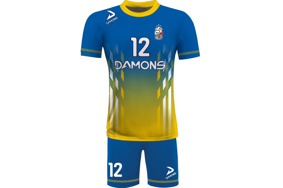 Zamów Strój Siatkarski Męski Omega 7 Niebiesko-Żółty z nadrukami i numeracją, a przygotujemy wizualizację dla Twojej drużyny!