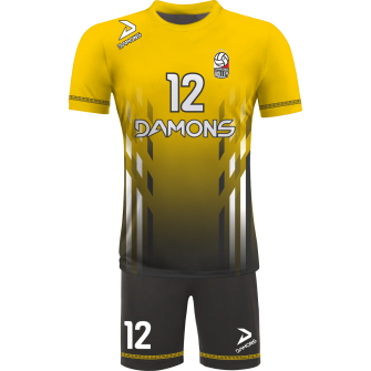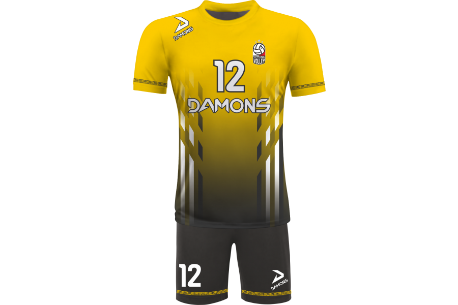 Zamów Strój Siatkarski Męski Omega 7 Czarno-Żółty z nadrukami i numeracją, a przygotujemy wizualizację dla Twojej drużyny!