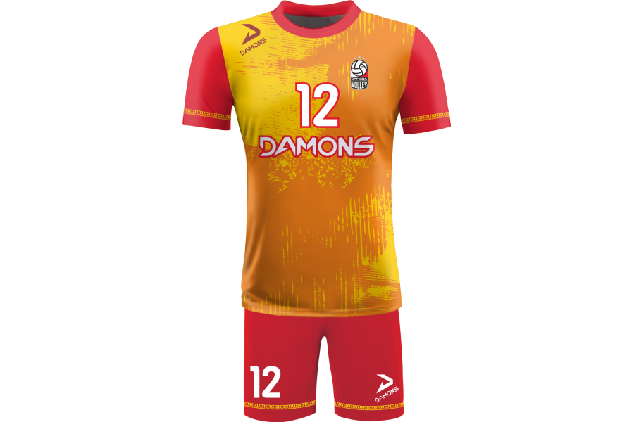 Zamów Strój Siatkarski Męski Omega 10 Żółto-Pomarańczowy z nadrukami i numeracją, a przygotujemy wizualizację dla Twojej drużyny!