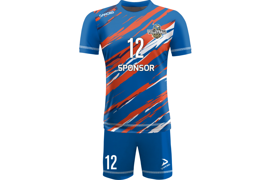 Zamów Strój Siatkarski Męski Omega 17 Niebiesko-Pomarańczowo-Biały z nadrukami i numeracją, a przygotujemy wizualizację dla Twojej drużyny!